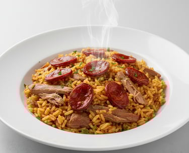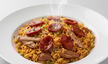 Arroz de forno com pato desfiado e rodelas de chouriço.