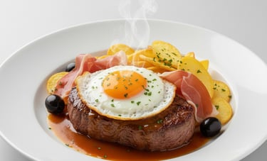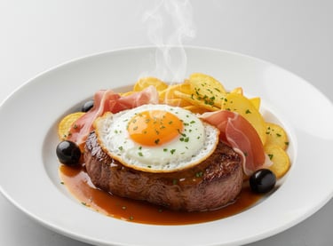 Bife de vaca com presunto, ovo estrelado e batatas fritas.