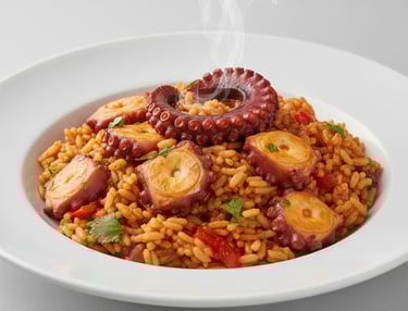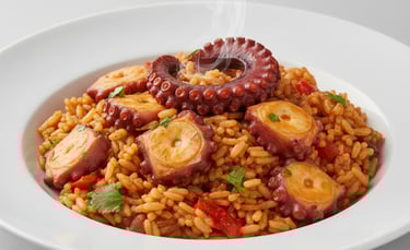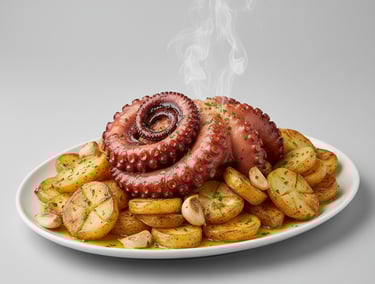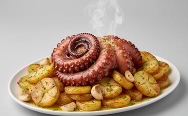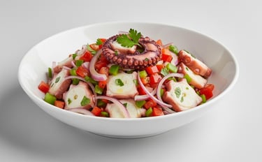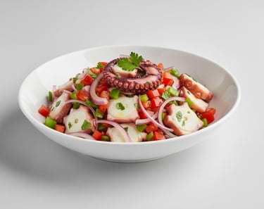 Polvo com pimentos, cebola e coentros, temperado com azeite.