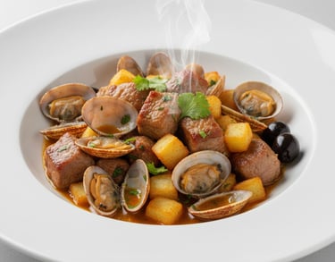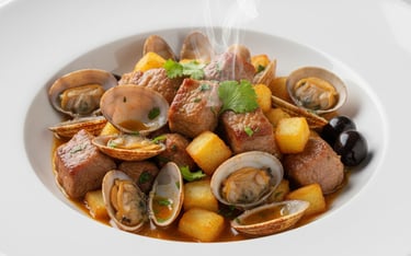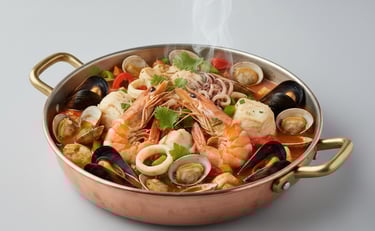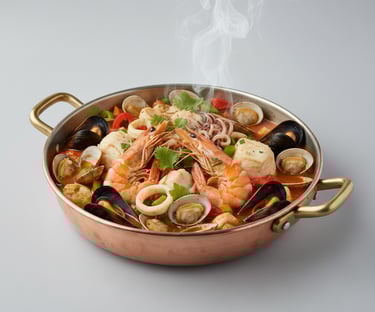 Mariscos cozinhados em cataplana com tomate, cebola e pimentos.