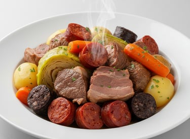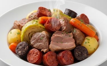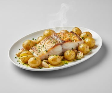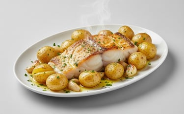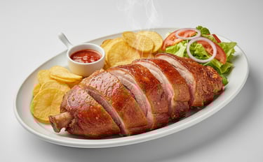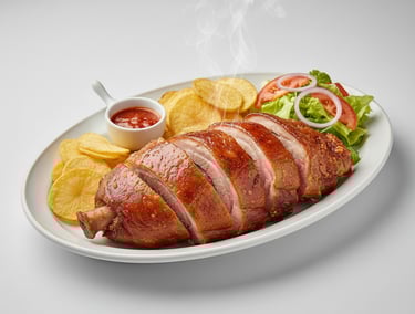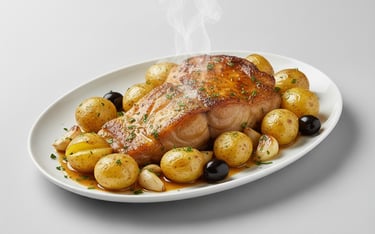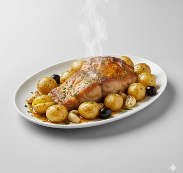 Cabrito tenro assado lentamente, acompanhado com batatinhas.