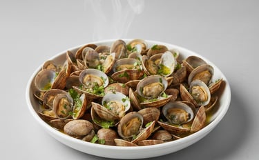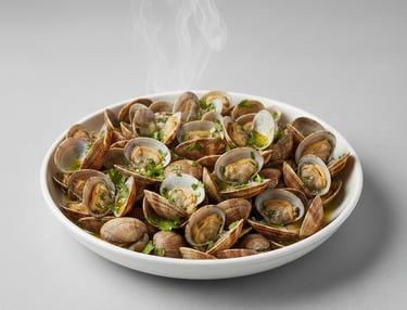 Amêijoas salteadas com alho, coentros e vinho branco.