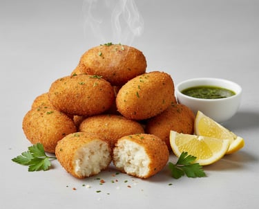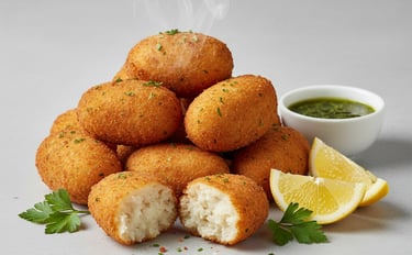 Croquetes de bacalhau e batata, servidos com salsa e limão.