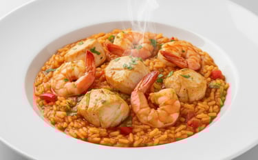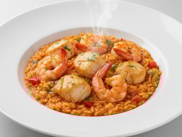 Arroz cremoso de tamboril e gambas, com toque de coentro.