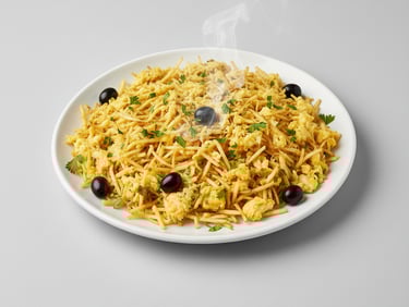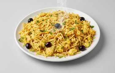 Bacalhau desfiado com batata palha e ovos mexidos.
